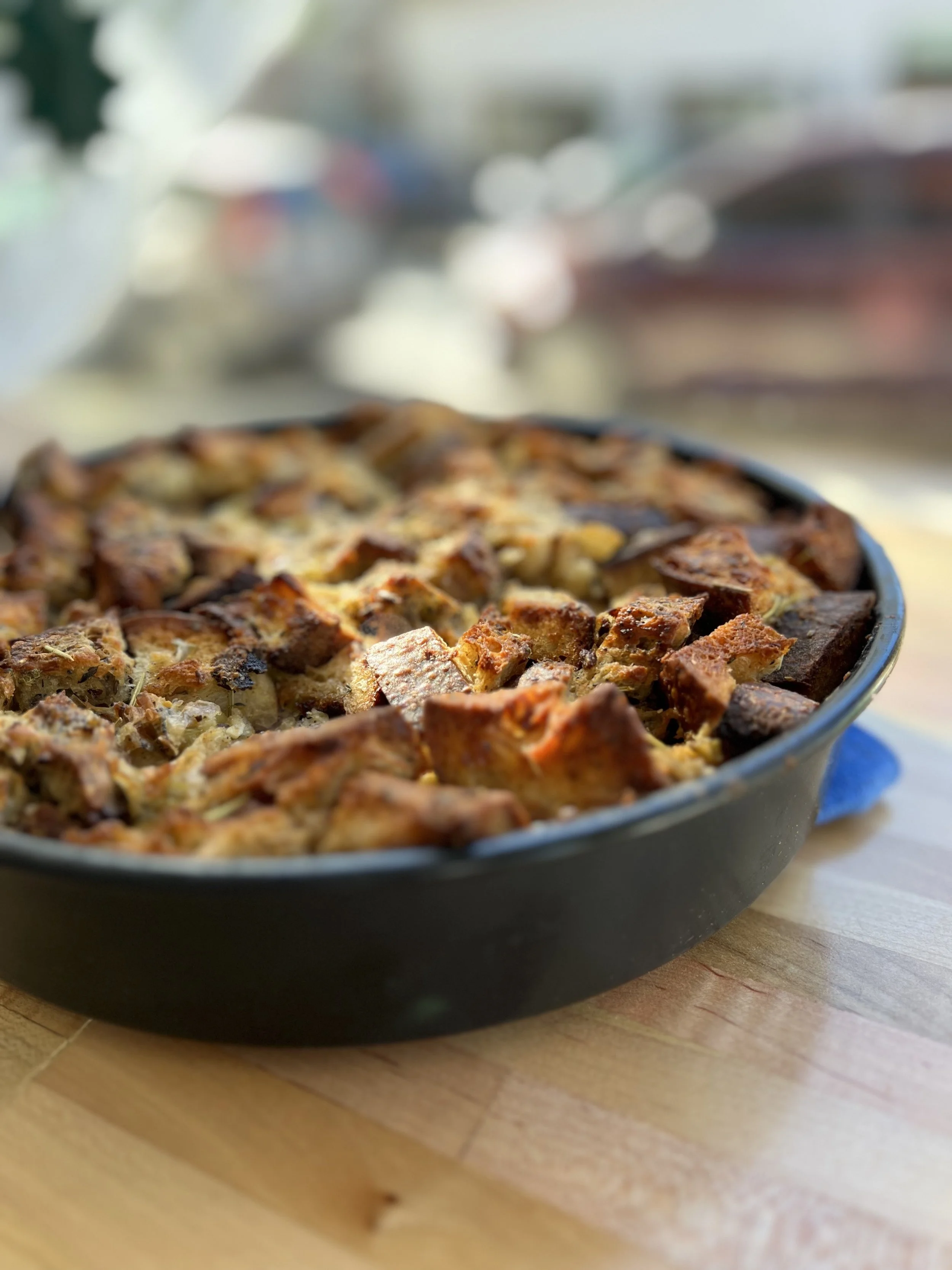 Oil a baking dish (we used a 10” round dish), then add the bread mixture, cover with foil and bake for about 30 minutes or when the internal temperature is 165°F.